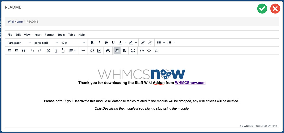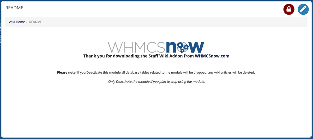 Organisation, Clarity and Collaborate is vital in the daily running of any business. With the Staff Wiki Addon by WHMCSnow your staff members can contribute to and search your wiki. Within the wiki you can store information such as business contact details, business policies and procedures, troubleshooting techniques and just about anything your business requires!